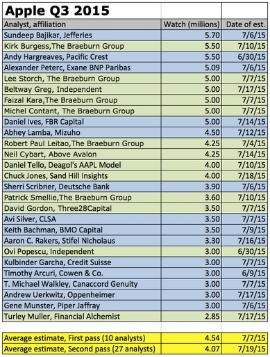 Самый пессимистичный прогноз сделал Турли Мюллер из Financial Alchemist. По его мнению, к концу июня объем продаж Apple Watch составил 2,85 миллиона экземпляров. Самым оптимистичным оказался Сандип Баджикар из Jefferies. Согласно его расчетам, в прошлом квартале было реализовано 5,7 миллиона Apple Watch.
