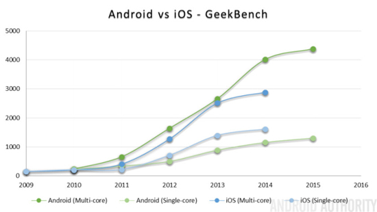 Как видно из графика, до 2013 года включительно производительность Android- и iOS-устройств находилась примерно на одном уровне. Более того, в 2013 году Apple сделала самый большой скачок, который затем ничем не компенсировали. А всему виной iPhone 6 и 6 Plus, которые получили более высокое разрешение, отчего существенного прироста в производительности мы не заметили. К слову, официально компания заявляла о 20-процентном приросте производительности, однако нами был проведен тест, согласно которому производительность возросла лишь на 11%.