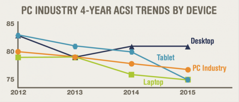 Многие аналитики в прежние годы предсказывали, что планшеты вытеснят в умах и сердцах потребителей персональные компьютеры. Однако продажи планшетов пошли на спад, и оптимизм относительно их будущего также уменьшается. Исследование от American Customer Satisfaction Index показывает, что уровень удовлетворённости потребителей планшетами в этом году снизился на 6%, а у ПК остался на прежнем уровне.