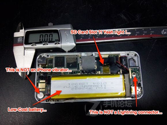 В SlashGear удивились наличию в iPhone 5S слота для карт памяти, которого отродясь не было в iPhone. На подделку также указывают дешевый аккумулятор, вибромоторчик неизвестного происхождения и разъем, который не имеет ничего общего с Lightning.