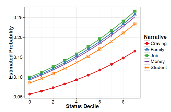 Один из существенных факторов — обещание заплатить позже. Кроме того, положительно влияет упоминание работы, семьи и денег. Сообщения от студентов получают чуть меньше положительных откликов, а самая стойкая негативная корреляция зафиксирована для так называемых «страстных прошений» (craving), то есть сообщений с упоминанием «друзей», «пьянства», «празднований» и т.д. То есть эдакие спонтанные просьбы, обычно не связанные с интересной историей.