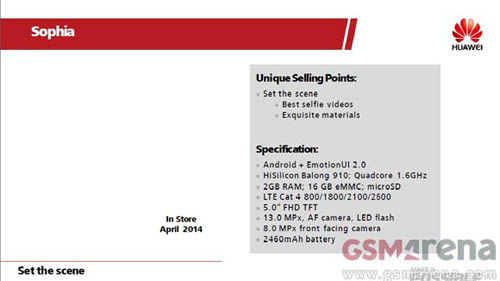 Новинка окажется преемником смартфона Ascend P6 и получит 5-дюймовый сенсорный TFT LCD-дисплей с 1080p разрешением, а в основе гаджета будет лежать чипсет HiSilicon Balong 910 с 4-ядерным процессором с тактовой частотой 1,6 ГГц.