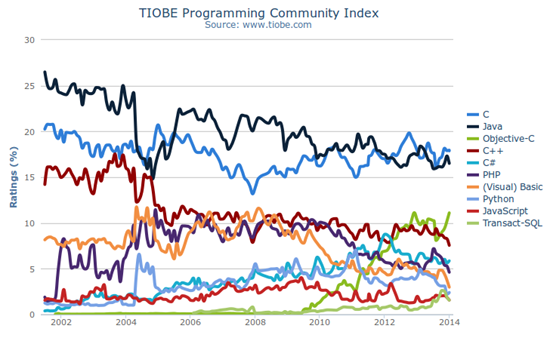 Эксперты компании TIOBE software опубликовали рейтинг популярности языков программирования в мире, составленный по данным на конец 2013 года.