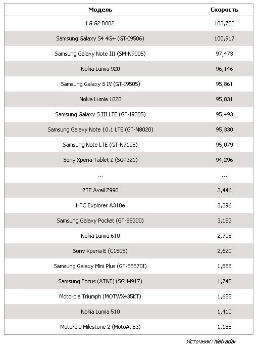 Самым быстрым смартфоном оказался LG G2 (D802), со средней скоростью загрузки 103,8 Мбит/с. LG G2 был выпущен в сентябре 2013 г. Устройство обладает 5,2-дюймовым дисплеем, 4-ядерным процессором и 13-МП камерой. Аппарат не имеет кнопок на передней панели и боковых гранях - они перемещены назад и находятся возле отверстия камеры.