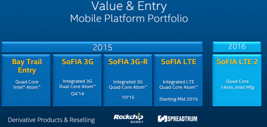 Хотя системы на чипе Intel Atom семейства SoFIA — это, в первую очередь, решения для недорогих смартфонов и планшетов, благодаря усилиям Intel и Rockchip в этом году подобные микросхемы обзавелись довольно достойным уровнем функциональности. К сожалению, самый продвинутый процессор семейства — Intel Atom x3-C344C с четырьмя ядрами Silvermont, графическим процессором ARM Mali T720 MP2 (16 потоковых процессоров, OpenGL ES 3.0, DirectX 9.3), встроенными 802.11ac WiFi, 4G/LTE, Bluetooth 4.1, GPS/GLONASS и т.д. — не появится на рынке до первого квартала 2016 года, по слухам, вследствие неготовности программного обеспечения. Тем не менее, в ближайшие годы SoFIA останутся важными продуктами для Intel. Настолько важными, что корпорация даже станет использовать для их производства собственные мощности начиная с конца 2016 г. Выпущенные на фабриках Intel микросхемы SoFIA будут иметь четыре ядра, более продвинутый модуль 4G/LTE, а также высокопроизводительное графическое ядро.