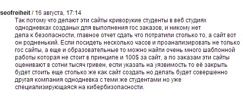 В рамках конференции, призванной обратить внимание на то, что в Украине нет своего бесплатного программного обеспечения, и предложить его создание, я познакомился с человеком из Симферополя, который работает на Microsoft и параллельно занимается обслуживанием одного из местных советов. Он мне рассказал о том, что у него сейчас заказали сайт для одного из местных советов, что стоит это порядка 500$, при этом объяснил, что требования заказчиков таковы, что необходимо будет поставить бесплатный движок типа joomla или WordPress, и дальше его дорабатывать. Группа наших экспертов уже показывала уязвимости всех версий движка WordPress, начиная от 3.5.1 и ранее. В результате чего мы имеем дополнительные расходы на создание сайта, потенциальную опасность его взлома и дополнительные расходы на исправление результатов взлома. Напомню, в случае с единым сайтом для всех государственных структур, исправляется сайт лишь в одном месте, а на всех его копиях лишь жмется кнопка «Обновить до последней версии».