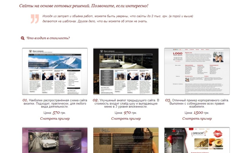 І дійсно, спробуємо пошукати в Google компанії, які готові зайнятися розробкою й захистом сайту. За першим посиланням натрапляємо на компанію eL'Dom. На веб-сторінці репрезентовані зразки створюваних ними сайтів, а також сума оплати послуг. Створення сайту за готовим шаблоном - ось якраз те, про що нам і потрібно дізнатися. Вартість - починаючи від 570 грн. Погодьтеся, це, все ж таки, не тисячі доларів.