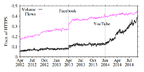 По результатам исследования, примерно половина сетевого трафика сейчас передаётся по HTTPS, в том числе 50% видеороликов с YouTube. Это значительно больше, чем было ещё пару лет назад. На диаграмме показана доля защищённого трафика на YouTube и Facebook за последние 2,5 года.