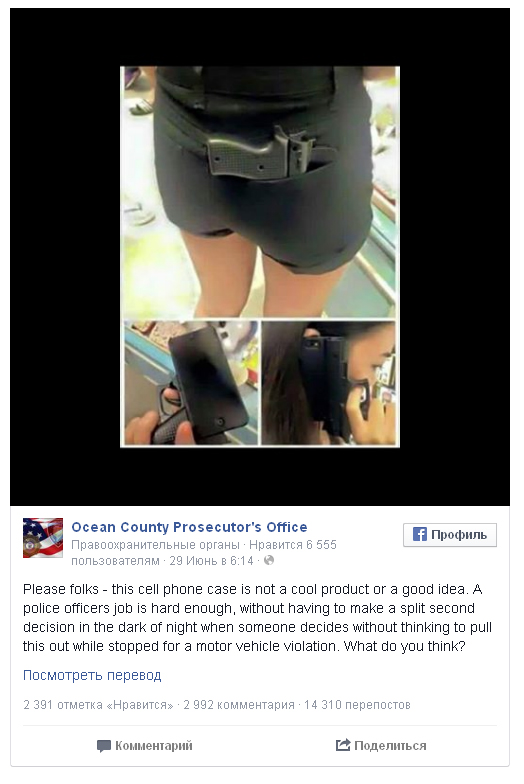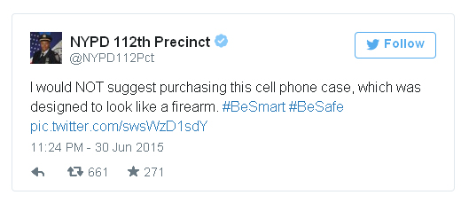 Полиция Нью-Джерси и и Нью-Йорка практически одновременно разместили записи в социальных сетях с одинаковым изображением и сопроводительным текстом, который указывает на то, что покупка чехла для смартфона в форме пистолета — это плохая идея: «Этот чехол не крутой продукт… Работа полицейских достаточно сложная и без того, чтобы рассуждать темной ночью, когда кто-то, не подумав, вытаскивает это [чехол в форме пистолета]».