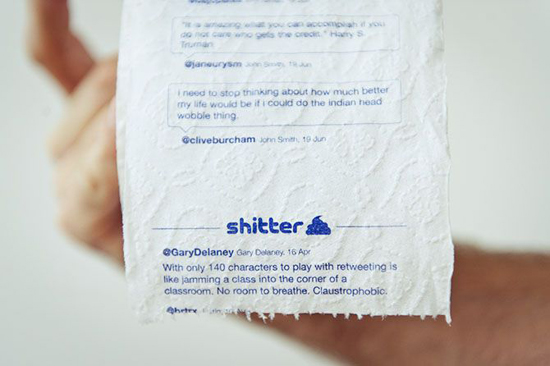 35 долларов США стоит набор из четырех рулонов туалетной бумаги с напечатанными на ней сообщениями из твоей ленты в Twitter. Такую нехитрую услугу предоставляет американская компания «Collector’s Edition». Название у такой персональной бумаги говорящее – «Shitter». Такой набор может стать забавным подарком, храниться годами в качестве летописи или использоваться по прямому назначению.