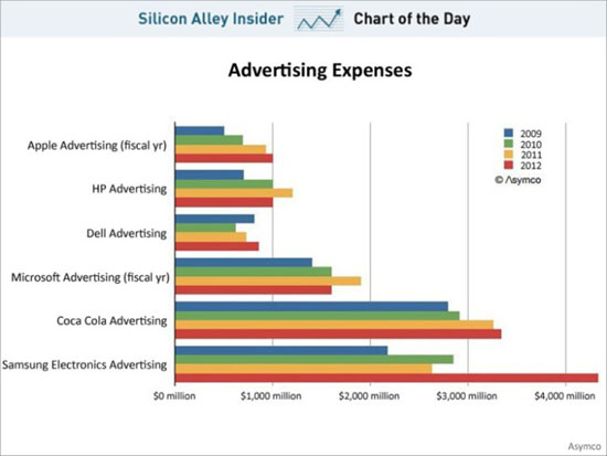 Безусловно, качество продуктов Samsung повлияло на их популярность, однако реклама тоже сыграла свою роль. По данным 2013 года, Samsung потратила 4 миллиарда долларов на рекламу в дополнение к 5 миллиардам долларов, затраченных в общем на маркетинг. Таким может похвастаться не каждая компания, и главное, что у Samsung есть такая возможность.