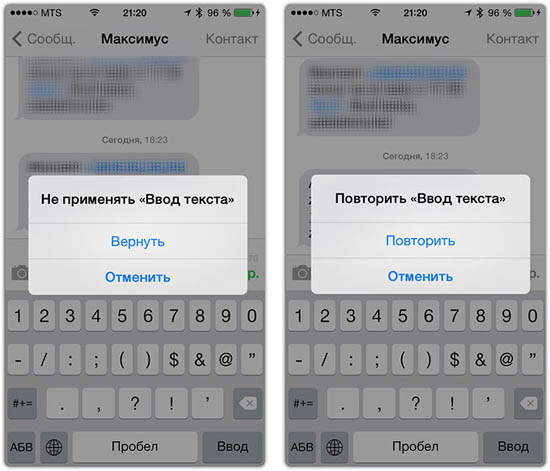 Не самая новая функция, но многие пользователи о ней и не подозревают. В iOS есть система отмены/повтора действий при работе с текстом. Набрали на экранной клавиатуре какой-то бред и хотите его быстренько удалить? Просто потрясите телефон и нажмите в появившемся меню на кнопку «Вернуть» — набранный текст, например, в SMS удалится. Если вдруг передумали — потрясите смартфон еще раз и кликните на «Повторить». Эта схема работает во всех местах, где присутствует поле ввода для текста.