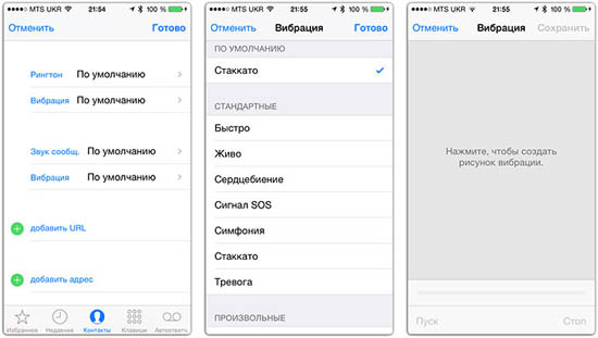 iPhone теперь умеет вибрировать по-разному. Достаточно зайти в свои «Контакты», выбрать любой и нажать на кнопочку «Изменить», после чего чуть пролистать вниз. Вы можете изменить схему вибрации как для рингтона, так и для сообщения, выбрав из десятка доступных вариантов или создав свой собственный.