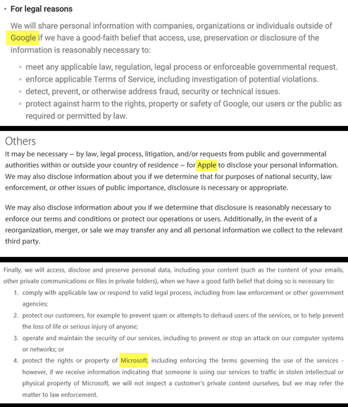 Те пункты, о которых сетовал доктор, абсолютно ничем не примечательны. Такие же пункты в практически таких же формулировках есть в соглашениях всех компаний, которые предлагают современные компьютерные услуги. Возьмем для сравнения фрагменты из соглашений конфиденциальности Google, Apple и Microsoft: