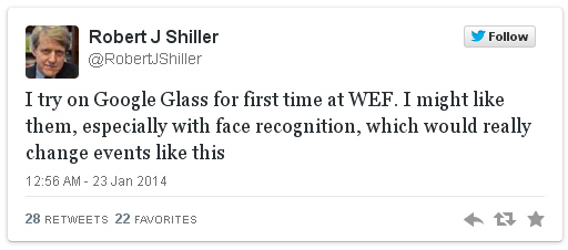 Профессор Йельского университета, Нобелевский лауреат по экономике Роберт Шиллер в своём твиттере предложил ещё один способ использования умных очков Google Glass.