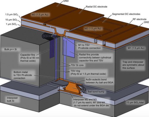 В чипе, созданном командой GTRI/Honeywell, эта проблема решена при помощи использования новых методом микро- и нанопроизводства, которые позволили завести на кристалл чипа большое количество электродов, оставив его верхнюю часть открытой для беспрепятственного доступа туда света лазера. Основа конструкции чипа позаимствована у конструкции корпусов электронных компонентов типа BGA (ball grid array). Матрица крошечных шаров-контактов позволяет подвести электроды напрямую от задней поверхности чипа к ее верхней поверхности, что дает очень высокий показатель плотности упаковки электрических соединений. Кроме этого, исследователи освободили дополнительное пространство поверхности чипа, заменив плоские поверхностные конденсаторы конденсаторами траншейного типа, отнесенными к самым краям кристалла чипа.