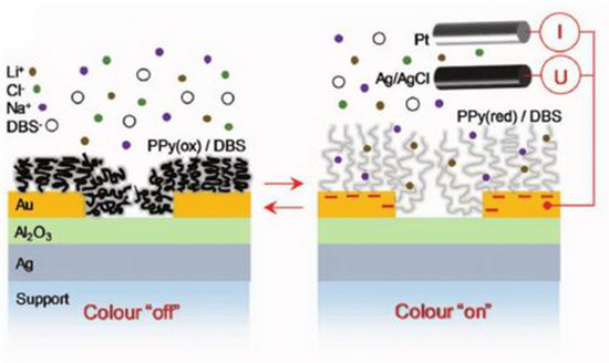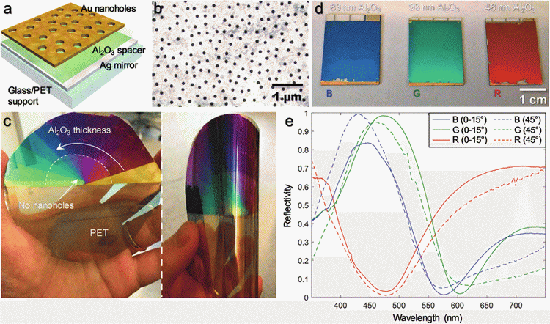 Структура нового материала допускает создание гибких устройств для чтения толщиной менее одного микрометра. При производстве «электронной бумаги» нового поколения используется многостадийная литография: вначале наносится базовый отражающий слой серебра толщиной 150 нм, затем — прослойка оксида алюминия, от толщины которой зависит цвет (эффект интерференции Фабри-Перо), а последние 20 нм занимает слой золота с наноотверстиями, расположенными на расстоянии порядка 150 нм друг от друга. Цвет, как уже было сказано, зависит от толщины оксидной прослойки: так, 48, 93 и 83 нм отвечают за красный, зелёный и синий цвета соответственно. За управление цветом отвечает слой полипирола (polypirrole), оптические свойства которого зависят от подаваемого электрического напряжения. В настоящее время исследователям удалось сформировать «лист» с пикселями базовых цветов размером не более 50 микрометров.