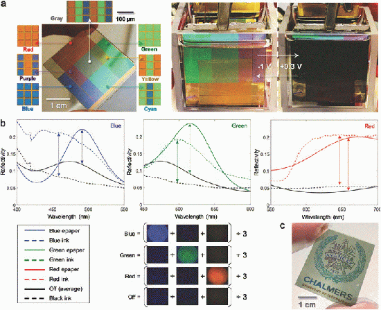 Решить эту проблему может технология, разработанная в Техническом Университете Чалмерса (Chalmers University of Technology, CUT), расположенным в городе Гётеборг, Швеция. Команда исследователей из CUT продемонстрировала плазмонные наноструктуры, которые в сочетании с особыми электрополимерами (electrically-tuneable polymers) могут выдавать практически любой цвет. Технология уже вышла из рамок чистой теории, и исследователи продемонстрировали гибкий лист «электронной бумаги» на основе новых принципов. Главным достоинством новой «бумаги» является возможность достижения очень высоких разрешений (теоретически достижима цифра 10 тысяч точек на дюйм), но помимо этого, новая «электронная бумага» в 10 раз экономичнее старой, а значит, она позволит создавать огромные электронные плакаты с высочайшей детализацией, но при этом весьма экономичные.