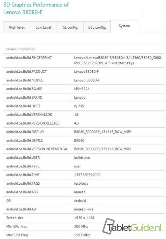 Lenovo B8080-F, согласно этим данным, получит экран с разрешением Full HD — 1920×1200 точек, против 1280×800 у оригинальной модели. Также 4-ядерный процессор MediaTek будет заменён на чип MSM8226. Это Qualcomm Snapdragon 400 с 4 ядрами Cortex-A7 @1,6 ГГц и графикой Adreno 305. Работает устройство под управлением Android 4.3.