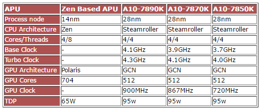 Использование Polaris 11 в сочетании с быстрой памятью (а возможно, и с некоторым интегрированным на подложку объёмом HBM) должно дать новому поколению гетерогенных процессоров AMD буквально новое дыхание там, где идёт речь о производительности в 3D-приложениях и играх. В сочетании с четырьмя процессорными ядрами, поддерживающими SMT и умеющими выполнять 8 потоков, это должно дать отличное недорогое решение для компактных систем с графической производительностью выше, чем у того же Xbox One. Теплопакет новых APU не превысит 65 ватт.
