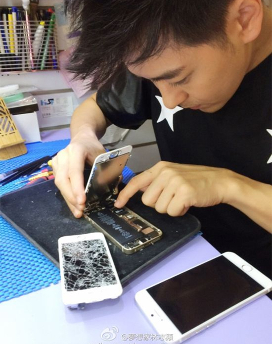На опубликованных сегодня фотографиях на 5,5-дюймовый iPhone 6 можно взглянуть поистине с близка. Певец опубликовал в своей учетной записи в Weibo фотографию, на которой он ремонтирует iPhone 5S с разбитым дисплеем, а рядом с ним на столе лежит 5,5-дюймовый iPhone 6.