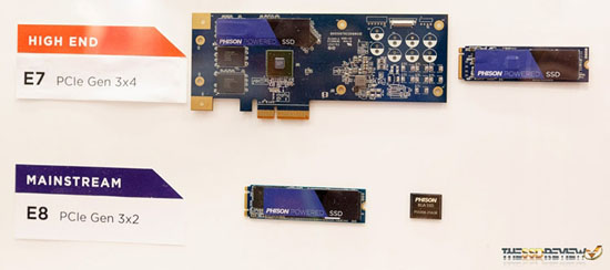 Подобный подход был взят на вооружение инженерами Phison и при разработке PCI-E контроллера E8 — недорогой альтернативы прошлогоднему решению E7. Новый продукт использует протокол NVMe и две линии PCI Express 3.0 вместо четырёх у E7. Гарантирована поддержка памяти типов MLC NAND и TLC NAND в однослойной и многослойной компоновке. Пиковая производительность Phison E8 оценена в 1,8/1,3 Гбайт/с (чтение/запись) и 240 000/220 000 IOPS (чтение/запись). Контроллер поддерживает технологии SmartECC, ETEP и HMB (Host Memory Buffer).
