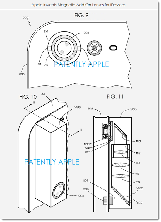 По сообщению зарубежного AppleInsider, вчера было опубликовано два патента, поданных компанией Apple: №8,638,369 «Задняя панель портативного устройства с различными вариациями объективов камеры» и №8,639,106 «Дополнительные магнитные объективы с выравнивающим стержнем».