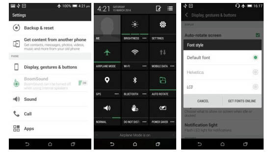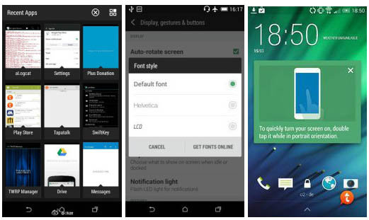 Не менее значимым изменением Sense 6 может стать продемонстрированная на одном из скриншотов возможность смены основного шрифта интерфейса, причем выбрать можно не только из стандартных вариантов, но и из специальной онлайн-базы. Подтверждается и наличие опции пробуждения экрана по двойному тапу, которая, кстати, уже используется в смартфонах Nokia Lumia. После включения дисплея перед пользователями предстанет измененный вариант способа разблокировки, с мгновенным доступом к списку приложений или каким-либо сервисам.