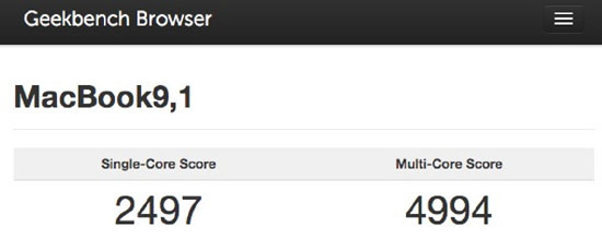 Тестирование 12-дюймового MacBook с 2-ядерным процессором Intel Core m5 с тактовой частотой 1,2 ГГц и ускорением Turbo Boost до 2,7 ГГц показало быстродействие на уровне 2 894 и 5 845 баллов. Таким образом, данная модель ноутбука на 15-18% производительнее, чем версия прошлого года на базе Broadwell и частотой 1,2 ГГц. По производительности она сравнима с 13-дюймовым MacBook Pro. Обновленная в 2015 году «прошка» на базе Intel Core i5-5257U демонстрирует в Geekbench результаты 2888 и 6066 баллов.