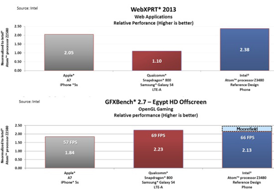Конкретные цифры таковы, при использовании последней версии бенчмарка WebXPRT 2013 «Merrifield» набрал 2,38 баллов, тогда как у A7 лишь 2,05, а у процессора Qualcomm и вовсе 1,1. Второй тест – GFXBench 2.7, модуль Egypt HD, интеловский чип с общим баллом 2,13 и 66 FPS обошел купертиновскую разработку с ее 1,84 и 57 FPS. Qualcomm Snapdragon 800, правда, оказался несколько лучше, у него 2,23 и 69 FPS, но на базе Merrifield уже создан его старший брат «Moorefield» и его показатели повнушительнее.