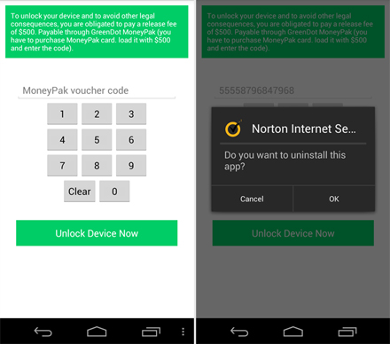 За разблокировку устройства, а также для снятия выдвинутых обвинений вымогатель требует заплатить выкуп в размере $500, предоставив ему код предоплаченной карты GreenDot MoneyPak.