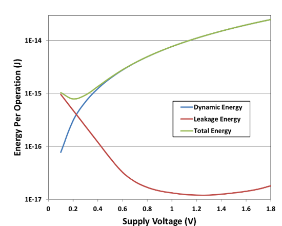Впрочем, пороговое значение не является абсолютом. В принципе, транзистор может функционировать и на околопороговых значениях напряжения, и на подпороговых значениях. Проблема в слишком большой утечке тока при таких условиях (утечка показана красным цветом на графике).