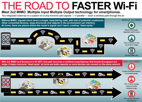 Компания Broadcom представила на выставке мобильной индустрии Mobile World Congress (MWC 2014), которая проходит сейчас в Барселоне (Испания), первый в мире чип 5G Wi-Fi (802.11ac) 2x2 MIMO, предназначенный для смартфонов и планшетов.