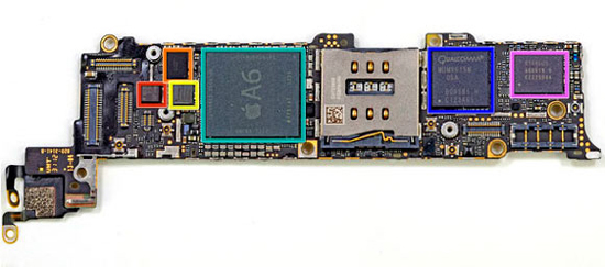 Аналогичные чипы (синий и фиолетовый) на системной плате, используемые в iPhone 5