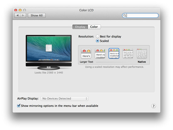 Пользователи и ранее могли подключить к Mac мониторы 4K, однако им были доступны разрешения от 640х1024 до 1200х1920. 4K подразумевает разрешение 3840х2160 точек. В OS X 10.9.3 оно доступно «из коробки», без использования неофициальных способов.