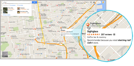 В новом интерфейсе улучшен поиск с учетом физического местоположения пользователя. Достаточно набрать «кофе» — и сразу на карте появится обозначение, где находится ближайшее кафе.