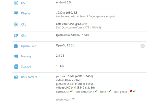 Смартфон несёт на борту 3 Гбайт оперативной памяти, флеш-модуль на 16 Гбайт с возможностью расширения, модули Wi-Fi, Bluetooth, NFC и GPS, акселерометр, гироскоп, электронный компас, датчики приближения и освещённости. На протестированном аппарате использовалась операционная система Android 6.0 Marshmallow.