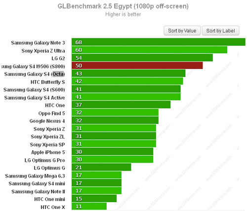 Что касается теста GLBenchmark 2.5 Egypt, то здесь вне конкуренции оказались Samsung Galaxy Note 3, Sony Xperia Z Ultra и LG G2. А Samsung Galaxy S4 I9506 занял четвертое место рейтинга, заметно улучшив результат смартфона Galaxy S4 на чипсетах Snapdragon 600 и Exynos 5 Octa.
