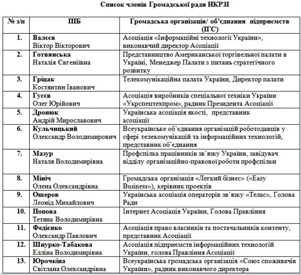 Председателем Общественного совета НКРСИ был избран глава совета Украинской ассоциации операторов связи «Телас» Леонид Ошеров, его заместителем - Председатель Правления Интернет Ассоциации Украины Татьяна Попова, секретарем - руководитель проектов общественной организации «Легкий бизнес» («Easy Business») Елена Минич.