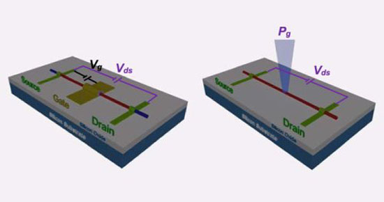 Как упоминалось выше, током через транзистор, разработанный учеными из Северной Каролины, управляет свет. Когда фотоны света начинают падать на определенный участок поверхности транзистора, он открывается и начинает пропускать ток от истока к стоку. И самым главным является то, что такие устройства могут иметь гораздо меньшие размеры, нежели обычные транзисторы, ведь у них полностью отсутствует управляющий электрод, затвор. Отсутствие этого электрода устраняет возможность возникновения паразитного тока за счет явления квантового туннелирования электронов от стока к затвору и от затвора к истоку, и наоборот.