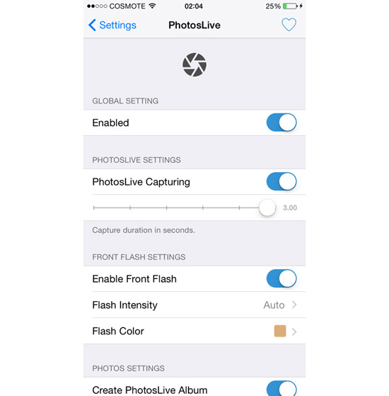 Новый твик для устройств с джейлбрейком PhotosLive воспроизводит технологию превращения статичных кадров в живые на гаджетах с iOS 8. За основу технологии берётся 8-мегапиксельный снимок. До и после него также записывается несколько секунд с движением и звуком. Продолжительность записи можно менять по своему усмотрению – от 0 до 3 секунд.