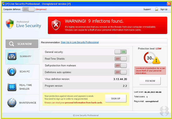 Вредоносное ПО загружается на ПК жертвы и устанавливает поддельную версию антивирусной программы Live Security Professional. Затем пользователю сообщают, что компьютер заражен огромным количеством опасных вирусов, для удаления которых необходимо осуществить подписку: