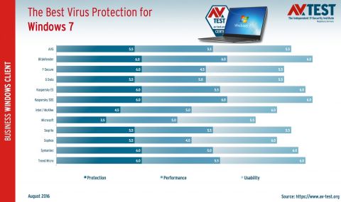 Также проведено тестирование антивирусов на Windows 7 для корпоративных клиентов. И здесь лидируют Bitdefender и Касперский с максимальными оценками. Trend Micro получает 5,5 за скорость, Symantec набирает 5 за скорость, AVG 5,5 в каждом тесте.