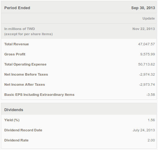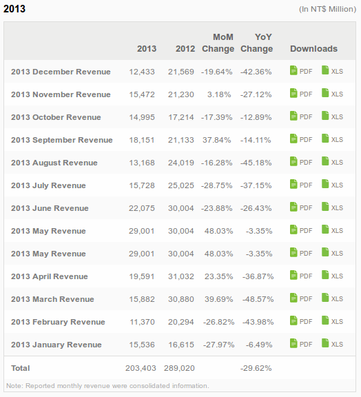 На графике, приведенном выше, можно наблюдать соотношение за 2011—2013 годы дохода компании в NT$ (в миллионах) и времени, за которое он стремительно сокращался.