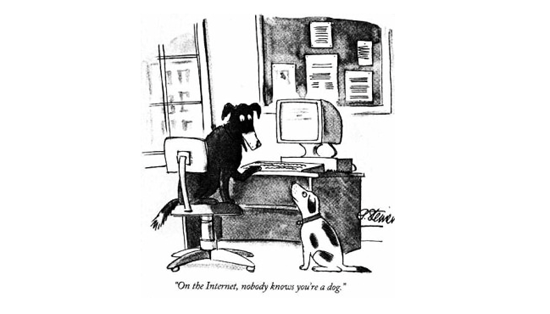 Подпись к одной из карикатур в «Нью-Йоркере»: «В Интернете никто не узнает, что Вы — обычный пёс». Суть этого утверждения в том, что в Сети барьеры вроде национальности, пола, классовой принадлежности, расы или образования не существуют. Здесь все равны, но равенство это может быть как в правах, так и в бесправии.