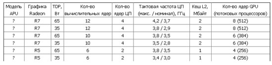 Как следует из таблицы, верхнюю ступень в семействе занимают решения с 12 вычислительными модулями (4 ядра CPU плюс 8 блоков GPU Radeon R7, что эквивалентно 512 шейдерным процессорам). Представители среднего звена отличаются от них другими частотными характеристиками и уменьшенным до шести количеством модулей GCN. При этом и топовые, и более доступные среднесегментные модели располагают 2 Мбайт кеша второго уровня.