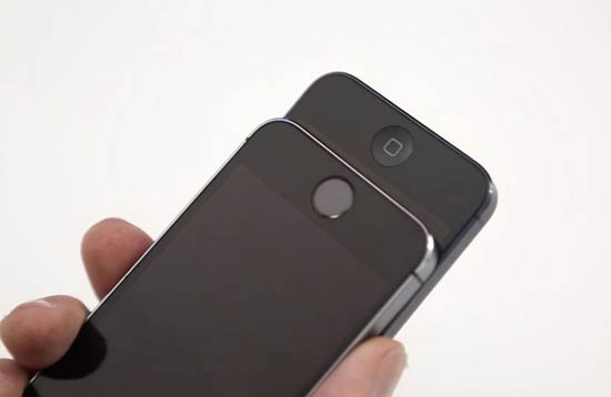 Фронтальная (лицевая) панель практически не претерпела изменений, за исключением кардинально обновившейся кнопки Home, в которой теперь располагается дактилоскопический сканер Touch ID. Сама кнопка теперь имеет правильную форму (в то время как в iPhone 5 она была вогнутой) и несколько «притоплена» в корпус устройства. Нельзя не заметить также отсутствия привычной квадратной пиктограммы, которая исчезла по очевидным причинам.
