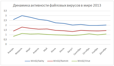 Как рассказали CNews в компании, прошлый год был отмечен появлением целого ряда новых вредоносных программ, а также модификаций уже известных угроз. Файловые вирусы в 2013 г. демонстрировали некоторое падение активности, но до сих пор представляют собой серьезную угрозу. В течение года сразу три семейства данных вирусов — Win32/Sality, Win32/Ramnit и Win32/Virut — стабильно попадали в глобальный рейтинг угроз.