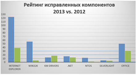 Ниже показан рейтинг компонентов в семействе ОС Windows, которые чаще всего обновлялись в 2013 г., а также сравнение данного показателя с показателем 2012 г.