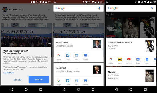 При установке английского языка системы становится доступной функция Now on Tap, которая позволяет вызвать подсказки Google Now в любом приложении прошивки. В зависимости от информации на экране помощник предложит дополнительную информацию вроде адреса заведения или новости по теме.